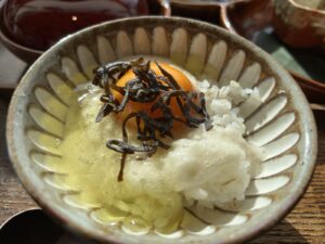 塩昆布をのせる、卵ごはん。