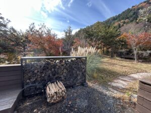 薪が積んであり、