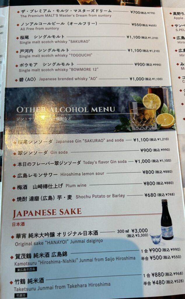ビール、ウイスキー、ジンソーダ、日本酒など。