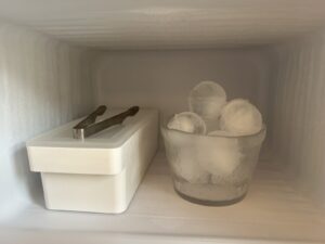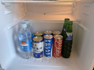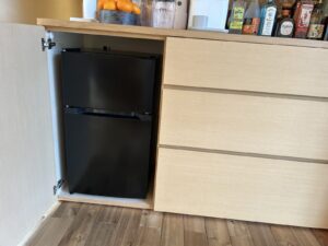 デスクの下には小さな冷蔵庫があり、