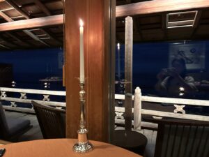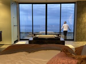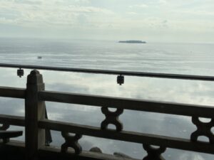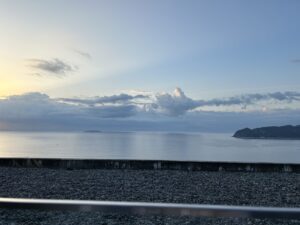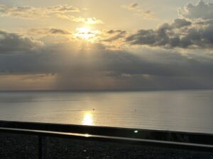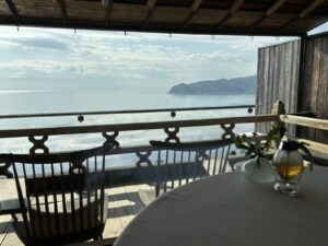 太陽の光を受けて輝く相模湾を見ながらの朝食。